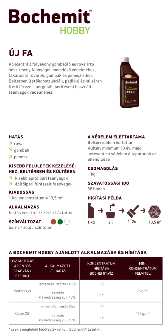 Koncentrált folyékony gombaölő és rovarirtó készítmény faanyagok megelőző védelméhez, fakárosító rovarok és penész ellen. Beltérben (tetőkonstrukciók, padlók) és kültéren (tető lécezés, pergolák, kerítések) használt faanyagok védelméhez.